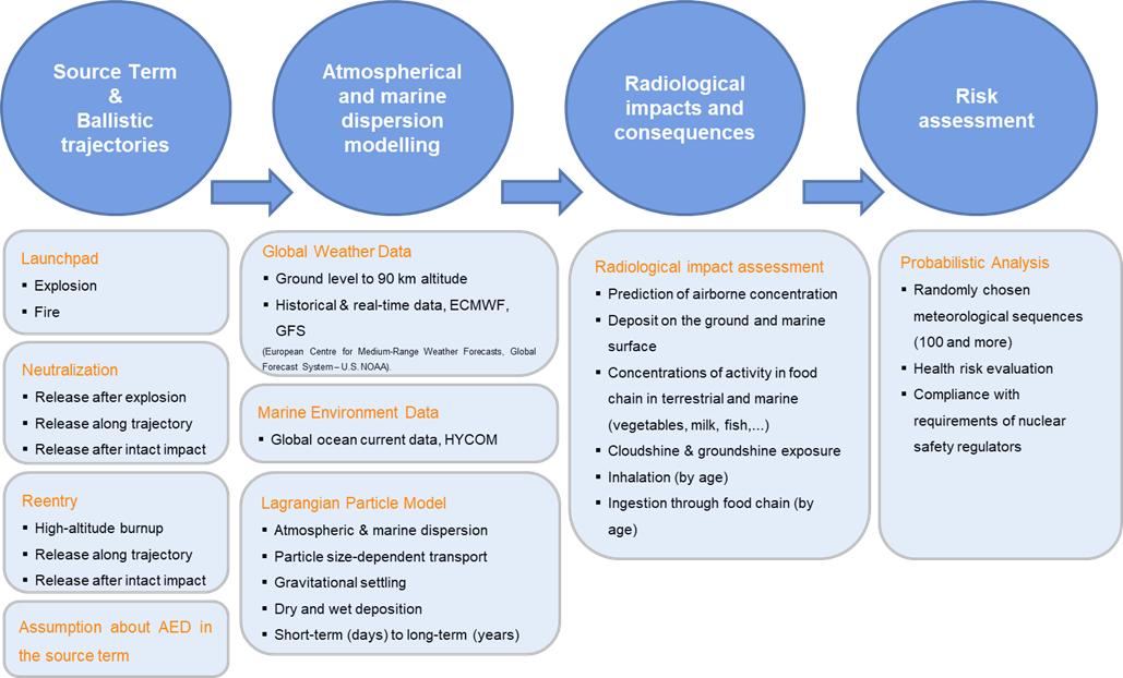 Based on the assumption of the source term, the ESTE4Space models short-term (days) and long-term (years) dispersion of radionuclides in the atmospheric and marine environments and calculates a whole set of radiological impact parameters necessary for the assessment of potential consequences to population and to the environment. Numerical weather prediction data for the entire Earth, from ground level to an altitude of 90 km, are available either as archived data from past years or as current numerical weather prediction data. Similarly, numerical marine current data for the entire planet, as well as archived data, are available for analyzing the radionuclide dispersion in the marine environment. The final task of the analyses performed by the ESTE4Space tool is radiological impact assessment in the territory of interest, which can span any area on the globe, including the surroundings of the launch pad.